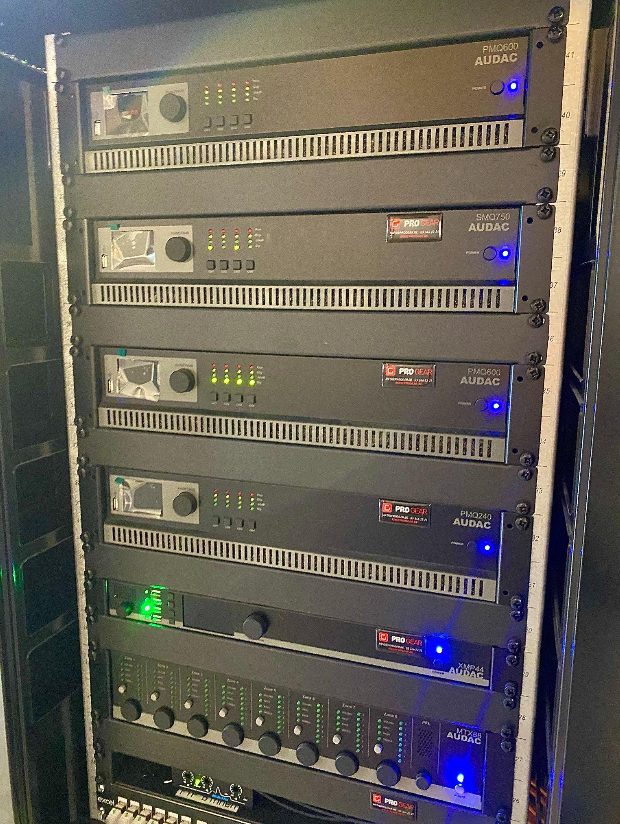 Beleving is hier het sleutelwoord en voor de audiobeleving werd dan ook beroep gedaan op Pro Gear uit Sint-Niklaas en het Belgische merk Audac. Een Audac MTX88 bestuurt een groot aantal zones, waaronder de winkel, het restaurant, de toiletten en het terras. Gezien de grootte van het pand en de te overbruggen afstanden, werd het duidelijk dat een 100 voltsysteem de juiste oplossing was.